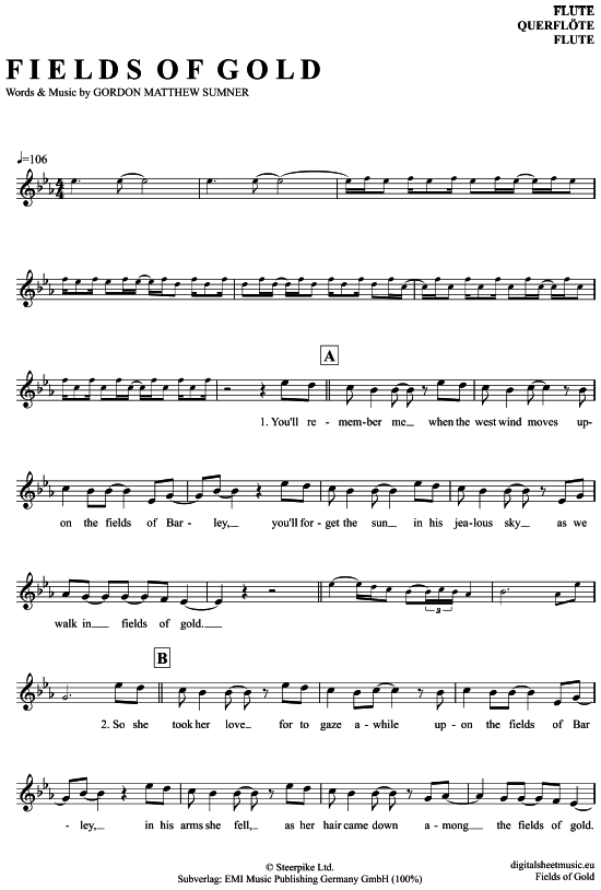 | "I’ve been Sting longer than I was Gordon Sumner. When I'm in New York, even the doorman calls me Mr. Sting. I'm comfortable with Sting. Gordon Sumner didn't suit me, never did. I was given the name Sting by people who knew me, and that name suited me." So schreibt Gordon Matthew Thomas Sumner alias Sting, Sohn eines Milchmannes und ehemaliger Lehrer für Englisch und Musik auf seiner offiziellen Website über den Nickname, den ihm ein Bandkollege verpasste (siehe auch Wikipedia-Artikel über Sting). Berühmter als so mancher Politiker oder Schauspieler gehört er mittlerweile zur Upperclass der Musiker, ähnlich wie die Beatles, Rolling Stones oder Phil Collins. Erreicht hat er diesen Status erst, nachdem er die sehr erfolgreiche Band Police verliess und eine Solokarriere startete und Songs wie Fields Of Gold schrieb. Er veröffentlichte das Stück 1993 auf dem Album Ten Summoner’s Tales zusammen mit so bekannten Songs wie If I Ever Loose My Faith In You, Seven Days oder Shape Of My Heart, für die er einen völlig neuen Sound erfand, bestehend aus einer Mischung verschiedener musikalischer Gattungen und Stile. Diese Art Musik erzeugt beim Zuhörer eine angenehme, entspannte, fast besinnliche Stimmung. Auf seiner Website werden die Stücke auf diesem Album als instantly likeable tracks beschrieben. Im folgenden Jahr 1994 kam dann das Doppel-Video-Album Fields Of Gold - The Very Best Of Sting 1984-1994 heraus. Danach stand das Stück wochenlang auf vorderen Plätzen in den Hitparaden vieler Länder. | ||