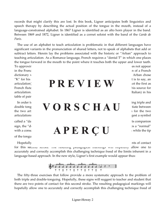 As a military musician, he may have been trained at the Paris Conservatory where Jean Baptiste Arban's Methode had been approved to be used for the training of military musicians in 1863. One might even speculate that Ligner was in a class that used Arban's method, if not being taught by Arban himself. Further, Ligner is thenbsp arranger of the overtures to Berlioz' Benvenuto Cellini and Mozart's Le nozze di Figaro for band. Innbsp the former arrangement, he is identified as having received an honor as a teacher however, the records that might clarify this are lost. In this book, Ligner anticipates both linguistics and speech therapy by describing the actual position of the tongue in the mouth, instead of a language-constrained alphabet.In 1867 Ligner is identified as an alto horn player in the band. Between 1869 and 1872, Ligner is identified as a cornet soloist with the band of the Garde de Paris. [...]"