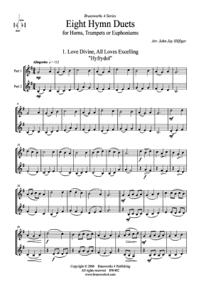These duets are written for two like-keyed instruments. They can be played, for example, by two horns in F, two trumpets in Bb, two euphoniums, or even a Bb trumpet and euphonium. The more adventurous might try mixed brass and woodwind combinations such as Bb clarinet/euphonium or Bb trumpet/bass clarinet!Each of the arrangements is given here with a popular hymn title, although most of the tunes are found in many hymnals with other texts as well.