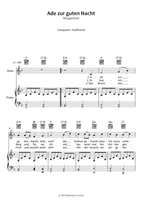 Ade zur guten Nacht - Wiegenlied - Noten für Gesang + Klavier, Gitarre traditional