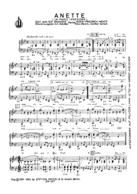 Anette (in Paris irgendwo) - Noten für Klavier Solo mit Text Margot Hielscher