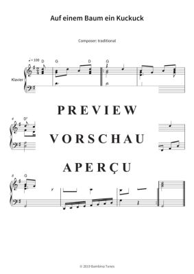Dieses Notenheft enthält die Originalnoten zum Kinderlied "Auf einem Baum ein Kuckuck" für Klavier. Mittlerer Schwierigkeitsgrad in G-Dur.
