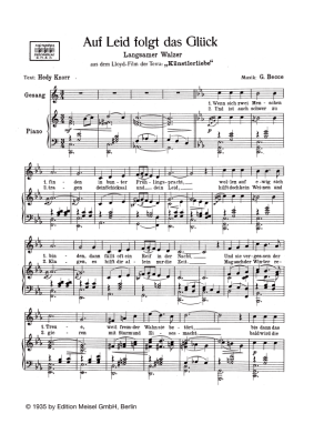 Auf Leid folgt das Glück - Noten für Klavier und Gesang Walzer aus dem Film: Künstlerliebe