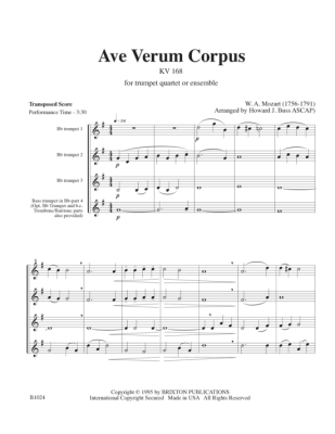Duration: 3´30" / The trumpet quartet is scored for 4 Bb, or 3 Bb and one Bb bass (or baritone or trombone). A bass clef part is included for the 4th part in case a bass trumpet is not available. This sensitive rendition of one of Mozart´s most sublime w