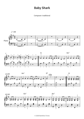 Dieses Notenheft enthält die Originalnoten zum Kinderlied "Baby Shark" für Klavier. Leichter Schwierigkeitsgrad in G-Dur.