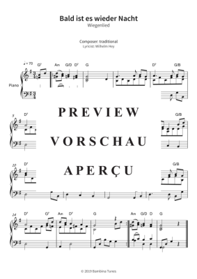 Bald ist es wieder Nacht - Wiegenlied - Noten für Klavier Solo traditional