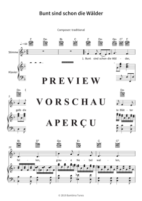 Dieses Notenheft enthält die Originalnoten zum Kinderlied "Bunt sind schon die Wälder" für Klavier, Gesang und Gitarre. Mittlerer Schwierigkeitsgrad in F-Dur mit Liedtext.