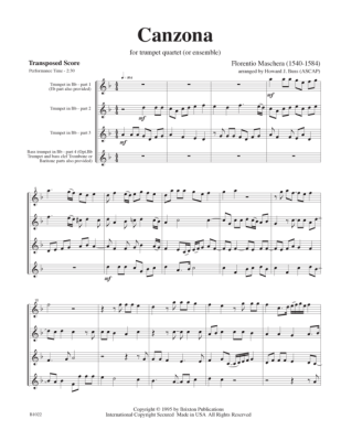 Duration: 2´30" / CANZONA by Florentio Maschera (1540-1584) transcribed by Howard J. Buss is scored for trumpet quartet: 4 Bb, or 3 Bb and one Bb bass (or baritone or trombone). A bass clef part is included for the 4th part in case a bass trumpet is not