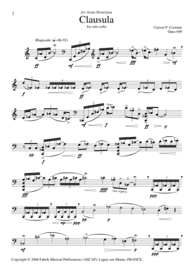Clausula II (2007) for solo cello was written for and is dedicated to composer Ezra Sims on the