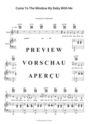 Dieses Notenheft enthält die Originalnoten zum Kinderlied "Come To The Window My Baby With Me" für Klavier, Gesang und Gitarre. Leichter Schwierigkeitsgrad in Es-Dur mit Liedtext.