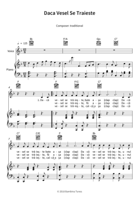 Dieses Notenheft enthält die Originalnoten zum Kinderlied "Daca Vesel Se Traieste" für Klavier, Gesang und Gitarre. Leichter Schwierigkeitsgrad in F-Dur mit Liedtext.