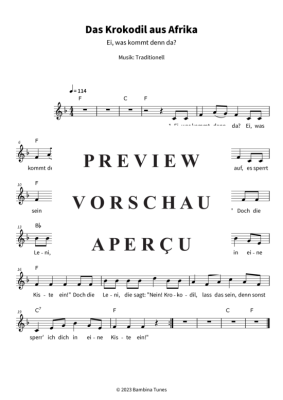 Dieses Notenheft enthält die Originalnoten zum lustigen Kinderlied "Das Krokodil aus Afrika (Ei, was kommt denn da?)" als Leadsheet. Für Anfänger arrangiert in F-Dur mit Liedtext.