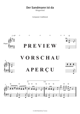 Der Sandmann ist da - Wiegenlied - Noten für Klavier Solo traditional