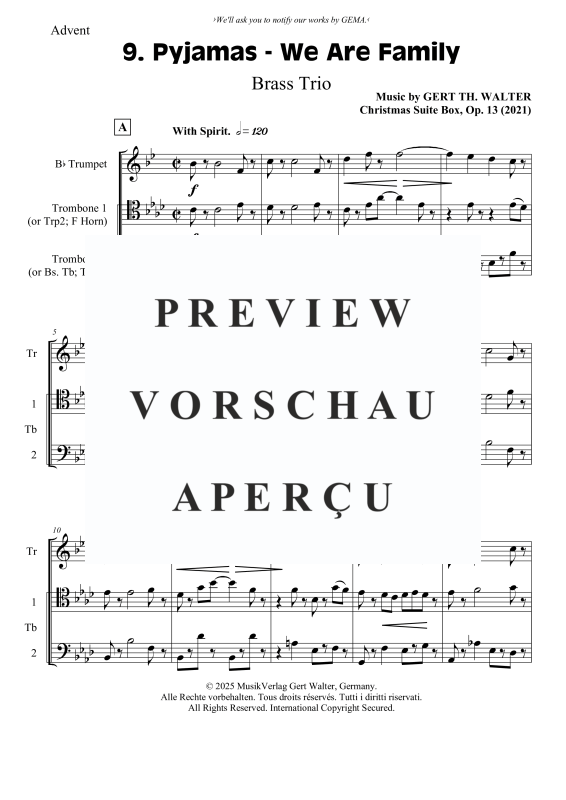 Sie suchen noch originelle Weihnachtsmusik für Ihr Blechbläsertrio? Los geht´s! "Pyjamas - We Are Family" ist der neunte Titel aus der Sammlung "Candy ´n Cake. The Christmas Suite Box": 1. Candy ´n Cake / 2. Trick Or Treat! / 3. The President´s Turkey-Pardon / 4. Thanksgiving Day / 5. Turkey´s Wishbone / 6. Black Friday / 7. National Christmas Tree / 8. Dyker Heights / 9. Pyjamas - We Are Family / 10. Hanukkah / 11. Stockings / 12. A Visit From St. Nicholas / 13. Santa Was Here! Wake Up! / 14. Mistletoe / 15. Yule Log / 16. Nothing Goes Out / 17. New Year´s Eve / 18. New Year´s Hymn.
