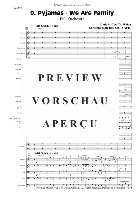 Sie suchen noch originelle Weihnachtsmusik für Ihr Sinfonieorchester? Los geht´s! "Pyjamas - We Are Family" ist der neunte Titel aus der Sammlung "Candy ´n Cake. The Christmas Suite Box": 1. Candy ´n Cake / 2. Trick Or Treat! / 3. The President´s Turkey-Pardon / 4. Thanksgiving Day / 5. Turkey´s Wishbone / 6. Black Friday / 7. National Christmas Tree / 8. Dyker Heights / 9. Pyjamas - We Are Family / 10. Hanukkah / 11. Stockings / 12. A Visit From St. Nicholas / 13. Santa Was Here! Wake Up! / 14. Mistletoe / 15. Yule Log / 16. Nothing Goes Out / 17. New Year´s Eve / 18. New Year´s Hymn.