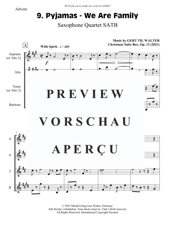 Sie suchen noch originelle Weihnachtsmusik für Ihr Saxophonquartett? Los geht´s! "Pyjamas - We Are Family" ist der neunte Titel aus der Sammlung "Candy ´n Cake. The Christmas Suite Box": 1. Candy ´n Cake / 2. Trick Or Treat! / 3. The President´s Turkey-Pardon / 4. Thanksgiving Day / 5. Turkey´s Wishbone / 6. Black Friday / 7. National Christmas Tree / 8. Dyker Heights / 9. Pyjamas - We Are Family / 10. Hanukkah / 11. Stockings / 12. A Visit From St. Nicholas / 13. Santa Was Here! Wake Up! / 14. Mistletoe / 15. Yule Log / 16. Nothing Goes Out / 17. New Year´s Eve / 18. New Year´s Hymn.