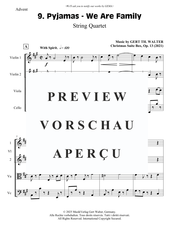 Sie suchen noch originelle Weihnachtsmusik für Ihr Streichquartett? Los geht´s! "Pyjamas - We Are Family" ist der neunte Titel aus der Sammlung "Candy ´n Cake. The Christmas Suite Box": 1. Candy ´n Cake / 2. Trick Or Treat! / 3. The President´s Turkey-Pardon / 4. Thanksgiving Day / 5. Turkey´s Wishbone / 6. Black Friday / 7. National Christmas Tree / 8. Dyker Heights / 9. Pyjamas - We Are Family / 10. Hanukkah / 11. Stockings / 12. A Visit From St. Nicholas / 13. Santa Was Here! Wake Up! / 14. Mistletoe / 15. Yule Log / 16. Nothing Goes Out / 17. New Year´s Eve / 18. New Year´s Hymn.