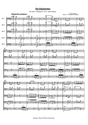 Frei nach dem berühmten "Elefanten" aus dem "Karneval der Tiere" von Camille Saint-Saens, gesetzt für 5 Kontrabässe. Allerdings haben sich hierein auch ein Thema einer Beethoven-Symphonie, ein bekannter Strauß-Walzer sowie ein berühmtes Thema von Schubert verirrt. Die Stimmen sind bewusst auf gute Spielbarkeit angelegt und die Funktionen von Melodieführung und Begleitung sind relativ "gerecht" auf alle Mitspieler verteilt.