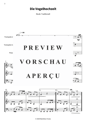 Das bekannte Volks- und Kinderlied "Die Vogelhochzeit" wurde fĂŒr ein BlechblĂ€sertrio mit zwei Trompeten in C und einer Posaune bearbeitet. Die Komposition steht in F-Dur und im 2/4-Takt und ist von leichtem Schwierigkeitsgrad. Diese Ausgabe eignet sich hervorragend fĂŒr Musiker, die frische und fröhliche Melodien in einem Ensemble spielen möchten, bei einem ĂŒberschaubaren Lernaufwand. Ideal fĂŒr Schulkonzerte, Familienfeiern oder auch Hochzeiten, bringt dieses Arrangement die fröhliche Melodie der Vogelhochzeit auf jede Veranstaltung.