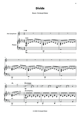 "Divide" by Christoph Meier arranged for alto saxophone and piano, this version keeps the song´s calm pulse and clear melodic line front and center, while the piano part supports with a steady, singable groove that feels good right away.