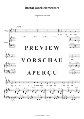 Dieses Werk enthält die Originalnoten des polnischen Kinderlieds "Dostal Jacek elementarz", einfach arrangiert in D-Dur für Klavier und Gesang.