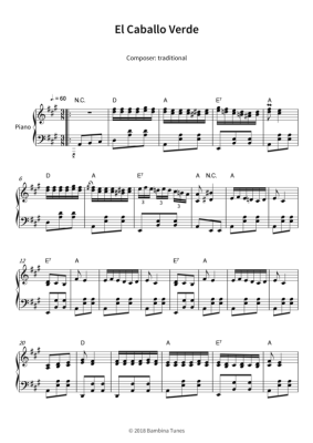 Dieses Notenheft enthält die Originalnoten zum Kinderlied "El Caballo Verde" für Klavier. Mittlerer Schwierigkeitsgrad in A-Dur.