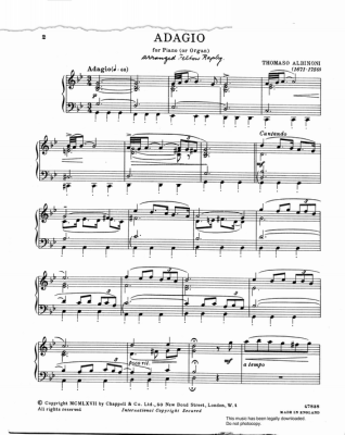 Adagio, composed by Tomaso Albinoni and arranged by Felton Rapley, in the key of G Minor arranged for piano or organ solo.