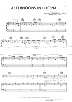 Afternoons In Utopia written by Marian Gold, Bernhard Lloyd and Rick Echolette, as performed by Alphaville arranged for voice and piano with guitar chords.
