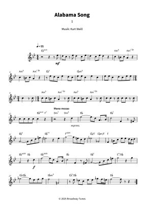 Play the legendary "Alabama Song" by Kurt Weill from "Rise and Fall of the City of Mahagonny" with this lead sheet for flute. Arranged in the original key of B flat major and in 4/4 time, it brings the bluesy, cabaret vibe perfectly to your trumpet. Thanks to the clear notation of melody and chords, it is suitable for beginners and professionals alike. It is ideal for solos, combos or concert and theater performances. Give the song your own interpretation and try it out with this leadsheet!