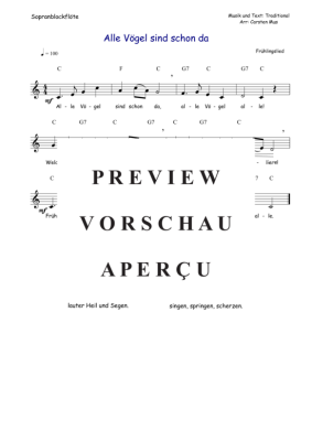 Alle Vögel sind schon da ist ein beliebtes Frühlingslied und für den fortgeschrittenen Blockflötenspieler bestens geeignet. Dazu die Akkordsymbole für ein Begleitinstrument in C und 3 Liedstrophen. (C - Dur)