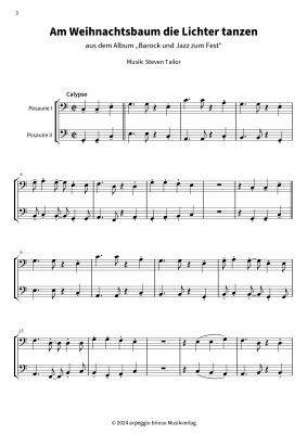 This sheet music book contains the sheet music for the Christmas carol "Am Weihnachtsbaum die Lichter tanzen" by Steven Tailor. Edition for trombone duo in easy difficulty in C major.