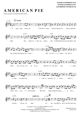 American Pie - Sheet Music for Tenor Saxophone Don Mclean