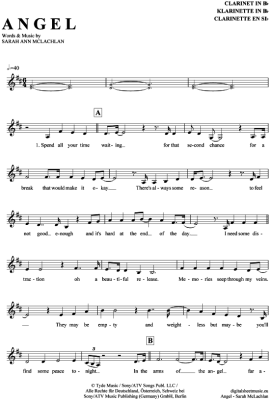 Angel - Sheet Music for Clarinet in B-flat Sarah McLachlan