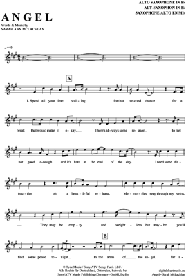 Angel - Sheet Music for Alto Saxophone Sarah McLachlan
