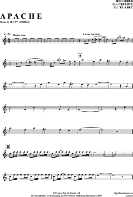 Apache - Sheet Music for recorder The Shadows