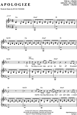 Apologize - Sheet Music for Piano and Voice Timbaland feat. OneRepublic