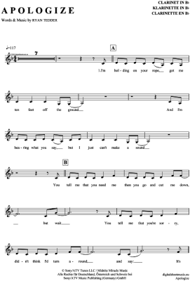 Apologize - Sheet Music for Clarinet in B-flat Timbaland feat. OneRepublic