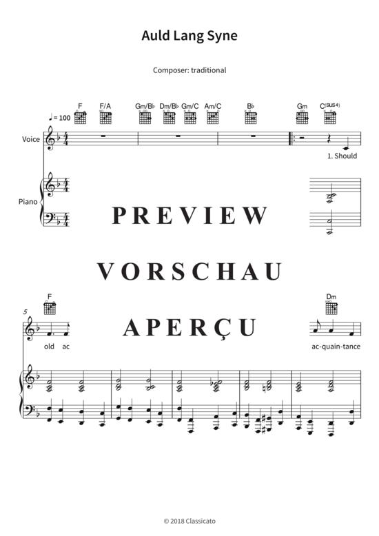 Dieses Notenheft enthält die Originalnoten zum Folk-Song "Auld Lang Syne" für Klavier, Gesang und Gitarre. Mittlerer Schwierigkeitsgrad in F-Dur mit Liedtext.