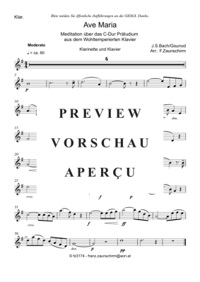 Ave Maria - Sheet Music for Klarinette in B Solo + Klavier-Playback Bach / Gounod (Zaunschirm)