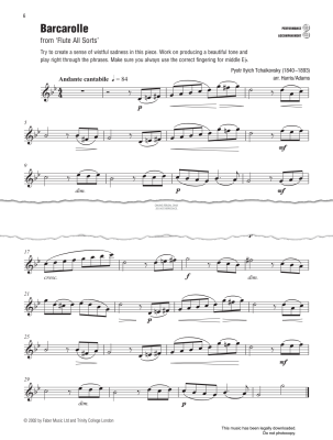 Barcarolle, composed by Pyotr Ilyich Tchaikovsky, arranged by Sally Adams and Paul Harris and selected by Sally Adams for flute with piano accompaniment in digital sheet music format.