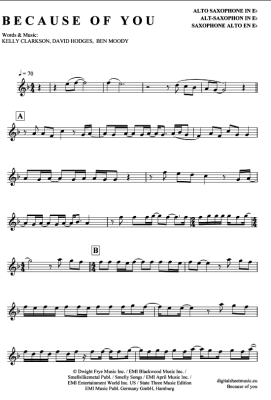 Because of You - Sheet Music for Alto Saxophone Kelly Clarkson