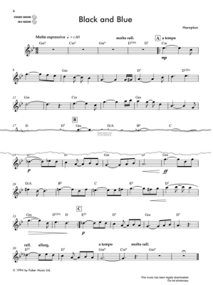 Black And Blue, written by Andy Hampton and arranged for flute with piano accompaniment in digital sheet music format. This piece is presented with extra helpful soloing guides to create authentic jazz solos.