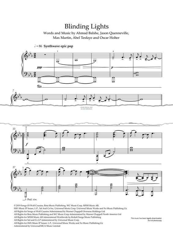 Blinding Lights by The Weeknd. Arranged for piano solo in digital sheet music format.