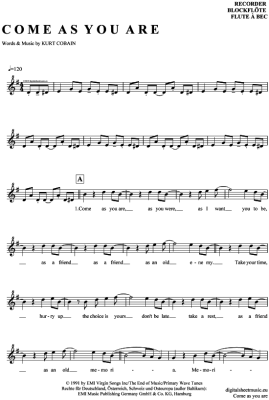 Come as you are - Sheet Music for recorder Nirvana
