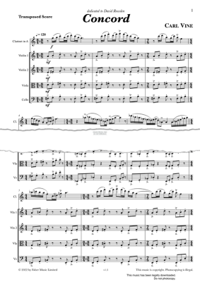 The transposed score for Concord, composed by Carl Vine for Clarinet In A and String Quartet in digital sheet music format.