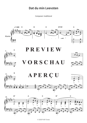 Dieses Notenheft enthΓ€lt die Originalnoten zum Folk-Song "Dat du min Leevsten" fΓΌr Klavier. Leichter Schwierigkeitsgrad in E-Dur.