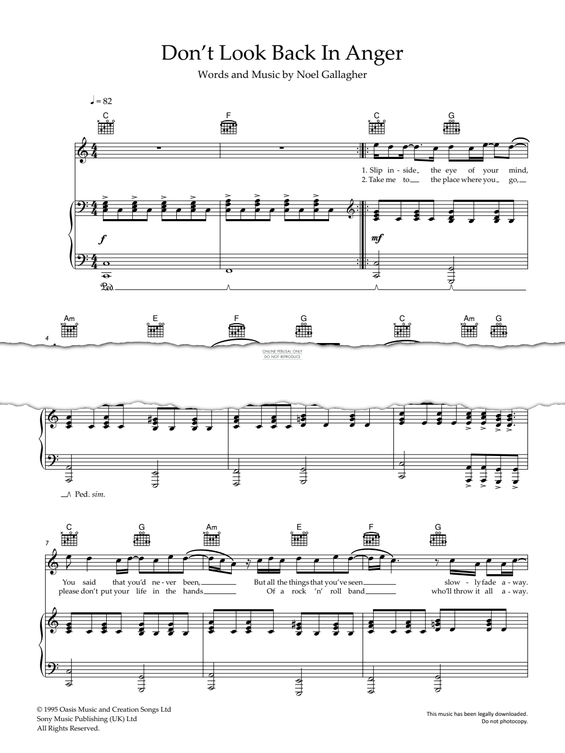 Don't Look Back In Anger, as recorded by Oasis and arranged for piano and voice with guitar chords in digital sheet music format.