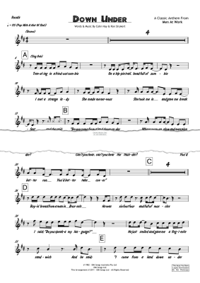 Considered by some the unofficial anthem of Australia, 'Down Under' was an 1981 hit for band Men At Work. Not only did it top the charts in Australia, but hit #1 in both the US and UK. This professional ensemble arrangement has been written for 3 Horns (Trumpet, Tenor Sax, Trombone), 4 Rhythm (Drums, Bass, Guitar, Keyboards), Vocals and Background Vocals.Â