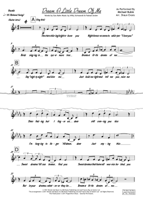 Dream A Little Dream Of Me' is a classic popular standard with Music by Willy Schwandt and Fabian Andre and Lyrics by the great Gus Kahn. Khan's lyrical journey is a swinging lullaby to a loved one. The song has seen many treatments over the years from the first 1931 recording by Ozzie Nelson & His Orchestra to Mama Cass of the Mamas & The Papas in '68. This 2010 Michael Buble version from the album 'Special Delivery' has been professionally arranged for 3 Horns (Trumpet, Tenor Sax, Trombone), 4 Rhythm (Drums, Guitar, Bass, Piano), Optional Keyboard Strings and Vocals. The opening Guitar solo has been notated in the Piano part for bands without Guitar. This chart was arranged by Shaun Evans and is presented as part of the PepperHorn Collections series from PepperHorn Music.