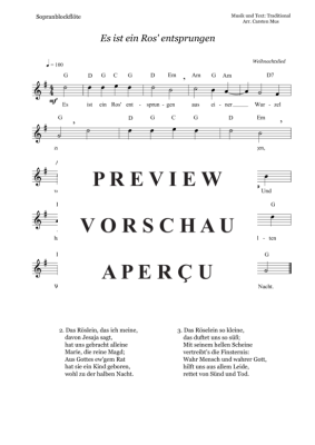 Es ist ein Ros´ entsprungen ist ursprünglich ein kirchliches Weihnachtslied aus dem 16. Jahrhundert. Das Weihnachtslied ist für den leicht fortgeschrittenen als Vorspiel oder Übungsstück bestens geeignet. Dazu 3 Liedstrophen zum Mitsingen. Die Akkordsymbole sind für ein Begleitinstrument in C angepasst. (G - Dur)